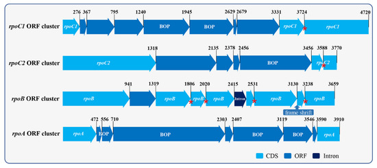 The fragmentation of rpo gene cluster. The red asterisk represents a detected in-frame stop codon; the shift mutation was labelled in a blue arrow. The BOP, EOP and POP represent ORF may have a bacteria, eukaryotic nucleus, and chloroplast origin respectively. ORF without BOP, EOP or POP label means no blast hit.