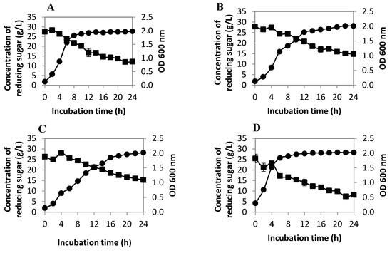 2.2.1. Cell Population and Reducing Sugar Utilization