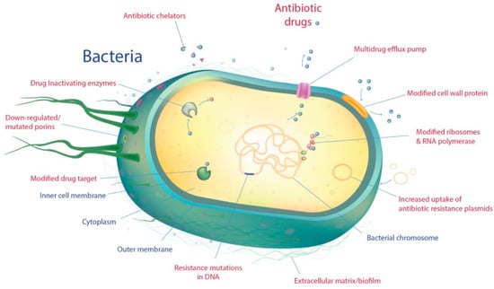 Modifying enzymes catalyze reactions including acetylation, phosphorylation, and adenylation. The steric hindrance caused decreases the affinity of the drug for its target, resulting in AMR [66,67]. One example is aminoglycoside acetyltransferase (AAC) found in Pseudomonas and Acinetobacter which can inactivate most aminoglycosides including amikacin and gentamicin [68,69]. These enzymes are either acquired through horizontal transfer of plasmids or transposons or through spontaneous mutations which expand the functionality of encoding genes [70]. The other mechanisms are target modification and lipopolysaccharides (LPSs) modification [71]. Where antibiotics affect bacterial cell-wall or target cell division, target modification works by either acquisition of binding proteins that do not affect cell-wall or acquisition of mutations within the RNA polymerase, DNA gyrase or topoisomerase IV, modification of ribosomal proteins, or protection of the target site by another protein altogether [17,67,72].