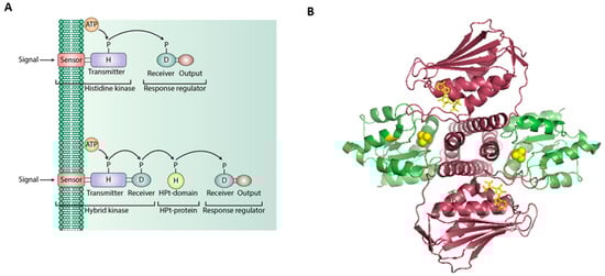 Schematic diagram of the functions and domains of sensor kinase and response regulator proteins in TCSs and HHK-mediated phosphorelays. (A) Representation of the classical TCS and phosphorelay signaling systems. (B) Structure of the complex between the entire cytoplasmic portion of Thermotoga maritima class I histidine kinase (magenta) and its cognate, response regulator (green) (PDB entry code 3 DGE) [91].