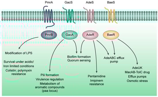 The known roles of PmrAB, GacSA, AdeRS, and BaeSR, two-component regulatory systems in antimicrobial resistance.