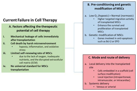 Current failures in cell therapy. (A) The patient’s age and mechanical and pathological conditions are among the factors that affect the therapeutic potential of cell therapy. In particular, transplanted cell survival may be affected by (i) mechanical stress during the transplantation procedure; (ii) a harsh microenvironment due to the activation of inflammation-related factors; (iii) oxygen and nutrient starvation due to poorly vascularized environments at the site of implantation; and (iv) a lack of optimization of the delivery protocols. (B) The benefits of cell transplantation could be improved by donor cell preconditioning or modifying transplanted cells prior to implantation to support or enhance their resistance to hypoxic stress. (C) The tissue engineering approach could enhance the survival of transplanted cells through the use of suitable biomaterials as carriers, such as a biologic-derived ECM scaffold. O2 = oxygen; Bcl-2 = B-cell lymphoma 2; EPO = erythropoietin.