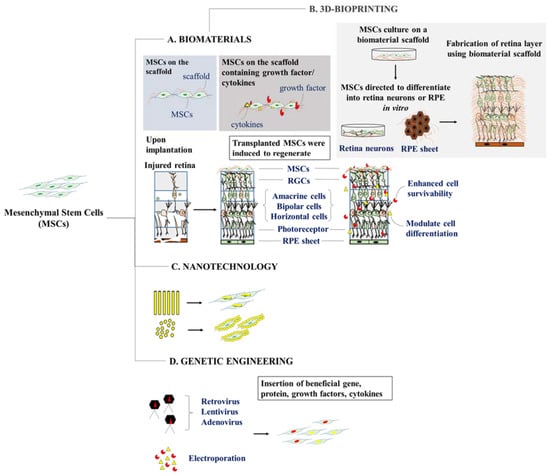 Strategies for empowering mesenchymal stem cells for ocular degenerative disorders. (A) The development of biomaterials can be utilized with or without the addition of growth factors or cytokines that may selectively promote multipotent mesenchymal stem cells (MSCs) either to restore or differentiate into desired cells. (B) Biomaterial can also be 3D-printed to form a sheet or layer of cells that resembles the local environment of the damaged site (Right). (C) MSCs can also be encapsulated or coated with nanoparticles of various sizes or origins to enhance the native property of MSCs. (D) Genetic modification of MSCs can be achieved by introducing MSCs with genes containing beneficial trophic factors or cytokines that could affect the physiological behavior of MSCs.