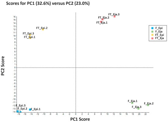 Two-dimensional principal component analysis (PCA) evaluating differences on the quantified proteins among sperm sources. PC1 discriminates between epididymal (Epi) and ejaculated (Eja) spermatozoa, whereas PC2 between fresh (F) and frozen-thawed (FT) spermatozoa. The squares represent the three technical replicates for each sperm source, based on the relative amounts of protein quantified in each one of them.