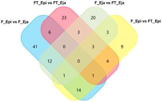 Venn diagram depicting the distribution of differentially abundant proteins among fresh (F) and frozen-thawed (FT) spermatozoa collected from cauda epididymis (Epi) and the ejaculate (Eja).