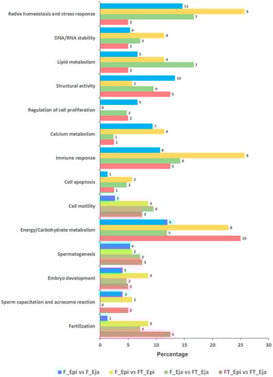 Bar chart depicting the Gene Ontology (GO) distribution of the differentially expressed sperm proteins according to their annotated function in UniProt KB and DAVID databases. Only categories directly or indirectly related to sperm and reproductive functions were considered. Fresh (F) or frozen-thawed (FT) mature boar spermatozoa collected from cauda epididymis (Epi) or ejaculate (Eja). Bars show the percentage of proteins in each functional group and the number in front of each bar indicates the number of proteins.