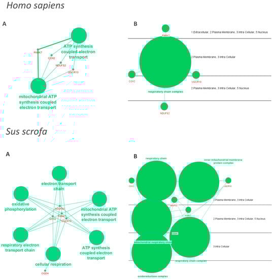 Networks highlighting the most relevant protein–protein interactions among those differentially abundant pig sperm proteins, comparing fresh and frozen-thawed ejaculated spermatozoa. The network was generated using Cytoscape and the ClueGO plug-in considering the database proteins of Homo sapiens or Sus scrofa. The networks were generated for functional (A) and subcellular localization (B) categories with the terms represented as nodes linked based on their κ-score level (≥0.4) is shown. The node size represents the relevance of enrichment.
