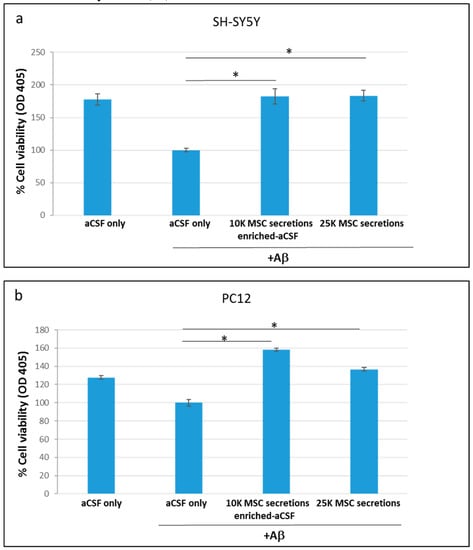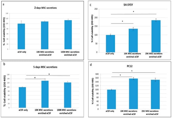 To find the optimal conditions (MSCs concentration and growing time in aCSF) for achieving effective enriched-aCSF, 10–100 K/mL MSCs were grown in aCSF for 2 and 5 days, and the enriched-aCSF was collected and tested for its effect on the viability of pheochromocytoma cells (PC12, provided by ATCC) following overnight (ON) treatment. This was followed by using enriched-aCSF from 10–25 K/mL MSCs growing in aCSF for 5 days, for testing its effect on the viability of PC12 as well as of neuroblastoma cells (SH-SY5Y, provided by ATCC). The effect of enriched aCSF on the viability of the neuronal cell lines was also tested under exposure to neurotoxins by treating the cells ON with the enriched-aCSF, followed by addition of 0.5 mM H2O2 (Sigma) for 4 h, or the addition of 4 μM Aβ25-35 (Sigma) (pre-aggregated at 37 °C for 10 min) for ON. Viability was determined, at least in 3–4 replicates per group, by MTT assay [].