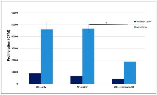 Proliferation in the presence of ConA was significantly suppressed in spleen lymphocytes treated with the enriched-aCSF compared to lymphocytes treated with (unenriched-) aCSF (an increase from 4200 ± 40.8 to 18,766 ± 1366.1 counts per minute (CPM) with ConA, and an increase from 6466 ± 131.2 to 46,683 ± 3566.2 CPM with ConA, in the enriched-aCSF vs. aCSF treated splenocytes, respectively, p = 0.0007). aCSF treated mice showed similar proliferation to splenocytes only (untreated) (Figure 3).