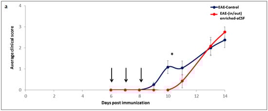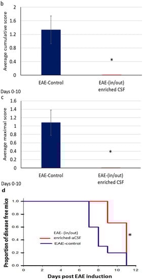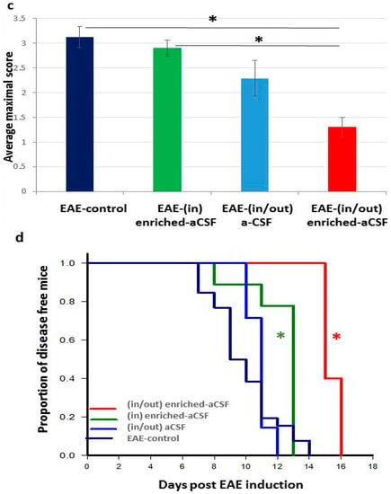 Kaplan Meier analysis revealed significant differences among the different groups in the proportion of disease-free mice (Log-Rank Test: p < 0.001), with each pair of groups showing significant differences (“in/out” enriched-aCSF-mice vs. all groups: EAE-control (p = 0.000387), “in” enriched-aCSF-mice (0.00507) and “in/out” aCSF-mice (0.0041); “in” enriched-aCSF-mice vs. EAE-control (p = 0.0415) and vs. “in/out” aCSF-mice (0.0141)), with the exception of the comparison between “in/out” aCSF-treated mice vs EAE-controls, which was not significant. The median value for the 50% chances to stay free of disease symptoms was 15, 13, 11, and 9 days for the “in/out” enriched-aCSF-mice, “in” enriched-aCSF-mice, “in/out” aCSF-mice and EAE-control, respectively (Figure 5d).
