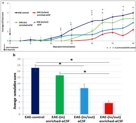 To determine whether the beneficial effect of therapy will be stronger and more prolonged, we next treated EAE-mice with a longer CSF exchange therapy, which was delivered during days 6–22 after disease induction (performed 5 times a week for 2 weeks). We used three protocols of prolonged CSF exchange therapy: “in/out” enriched-aCSF, “in” enriched-aCSF, and “in/out” aCSF (unenriched-aCSF). Since the clinical symptoms of the control EAE-mice in the various separate experiments, measured as average, cumulative, and maximal score, and the Kaplan Meier analysis were similar (no significant difference in one-way ANOVA analysis) we pooled the control EAE-mice results, and used them for comparison of the efficacy of the different CSF exchange therapies. Repeated ANOVA analysis showed a significant difference between the different treatment groups (f(2,24) = 9.59, p < 0.001)), with Tukey Post-hoc analysis showing significant differences between the control EAE-mice and each treatment group (p < 0.001, p = 0.035 and p = 0.001 for “in/out” enriched-aCSF, “in” enriched-aCSF, and “in/out” aCSF, respectively). While the “in/out” enriched-aCSF mice showed a significantly lower average score relative to controls at all days of follow-up of disease symptoms (p = 0.005, p = 0.013, p < 0.001, p = 0.001, p = 0.001, p = 0.005 for days 11, 12, 14, 15, 17, 18 post induction), the “in” enriched-aCSF mice showed a significantly lower average score relative to control-EAE (p < 0.001, p = 0.01, p = 0.002) only at days 11, 12, 14, respectively; the “in/out” aCSF mice showed a significantly lower score (p < 0.001, p = 0.01, p = 0.019) only at days 14, 15, 17 (with a similar trend (p = 0.066) also at day 18). A lower average score of “in/out” enriched-aCSF-mice was demonstrated relative to that of “in” enriched-aCSF-mice at days 15 and 17 (p = 0.06 and p = 0.03, respectively). These results show that the “in/out” enriched-aCSF therapy was the most effective one, affecting both time of onset (EAE-control mice develop the disease at day 10 while the treated mice at day 14 post induction) and disease progression. The “in” enriched-aCSF treatment, on the other hand, was only beneficial in delaying disease onset (EAE-control mice developed the disease at day 10 while the “in” enriched-aCSF-mice treated mice at day 12 post induction), and the “in/out” aCSF” treatment was most effective in interfering with disease progression rather than in delaying its onset (Figure 5a). A significant difference in the average cumulative score between the groups was noticed (one-way ANOVA (f(3,44) = 11.04, p < 0.001)); further analysis with Tukey Post-hoc showed that the (in/out) enriched-aCSF-mice and the (in/out) aCSF had lower scores compared to EAE-controls (p < 0.001, p = 0.008, respectively), and (in/out) enriched-aCSF-mice having lower scores than the (in) enriched-aCSF-mice (p = 0.004) (Figure 5b). A significant difference in average maximal score between the groups was noticed (one-way ANOVA (f(3,48) = 5.55, p = 0.003)); further analysis with Tukey Post-hoc showed that the (in/out) enriched-aCSF-mice had a lower score compared to control and (in) enriched-aCSF (p = 0.002, p = 0.02, respectively) (Figure 5c).