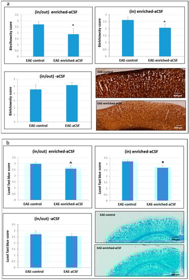 LFB staining for the degree of demyelination following CSF exchange therapy revealed a trend of less demyelination in the “in/out” enriched-aCSF treated-mice relatively to the EAE-control mice in the cortex (2.58 ± 0.22 vs. 2.98 ± 0.14, respectively, p = 0.09). Moreover, a significantly lower degree of demyelination was noticed in the “in” enriched-aCSF-mice relative to the EAE-control mice (2.69 ± 0.19 vs. 3.21 ± 0.09, respectively, p = 0.02), but there was no difference in demyelination between the “in/out” aCSF-treatment and the EAE-control (2.56 ± 0.187 vs. 2.70 ± 0.255, respectively, p = 0.314) (Figure 6b).