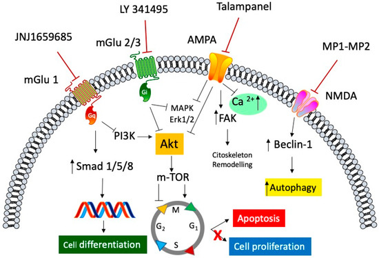 General representation of the signaling pathways involved in the antagonism of both ionotropic and metabotropic glutamate receptors in anti-cancer mediated effects. Selective metabotropic glutamate receptor 1 (mGluR1) antagonist JNJ1659685 elicited its anti-cancer activity, by decreasing cell proliferation, through the inhibition of the phosphoinositide 3-kinase/protein kinase B (PI3K/Akt) pathway, and by increasing cell differentiation through the activation of the transcription factors small mother against decapentaplegic transcription factor (Smad) 1/5/8. LY 341495, an mGluR 2/3 selective antagonist, blocks the activation of both the mitogen-activated protein kinase (MAPK)/extracellular signal-regulated kinase (ERK)1/2 cascade and the Akt/mammalian target of rapamycin protein (mTOR) pathway, resulting in arrest of the cell cycle and an increase in apoptosis. Talampanel, a selective negative allosteric α-amino-3-hydroxy-5-methyl-4-isoxazole propionic acid (AMPA) modulator, inhibits the rise of intracellular calcium concentration, and inhibits both ERK1/2 and Akt phosphorylation, slowing down the cell proliferation, and increasing cellular stiffness through the activation of focal adhesion kinase (FAK) protein. The N-methyl-d-aspartate (NMDA) antagonists, MP1 and MP2, two memantine derivative compounds, exert their antiproliferative activity by modulating Beclin-1 binding protein, which increases the autophagic processes of glioblastoma cell line.