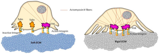 Schematic representation of cell reorganization on soft and rigid extracellular matrix (ECM) substrates. The actomyosin II system connected to focal adhesion complexes generates intracellular contractile forces which are transmitted to the underlying substrate, following a dynamic and mutual information exchange that can lead to changes in cell motility. A soft substrate (left) entails reduced activation of integrins, not allowing the formation of stress fibers within the cell. Conversely (right), a rigid substrate promotes the integrin activation, as well as a remarkable recruitment of actin filaments, leading to a global reinforcement of the cell, thus affecting the cell migration ability.