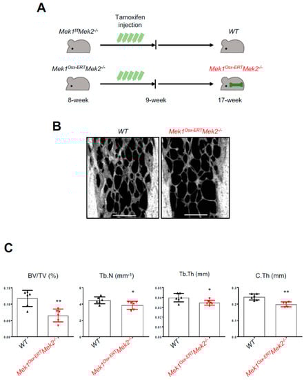 2.3. Inducible Inactivation of the ERK Pathway in Osteoprogenitors Results in Osteopenia in Adult Mice