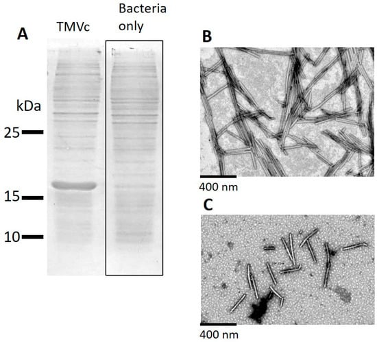 (A) Coomassie stained SDS PAGE of lysates derived from BL21(DES)pLysS bacteria only or those expressing tobacco mosaic virus derived virus-like particles (TMV VLPs) (TMVc); molecular weights are indicated on the left side. (B) Transmission electron microscopic analysis of TMV VLPs, and (C) wild type TMV particles, with scale bars shown.