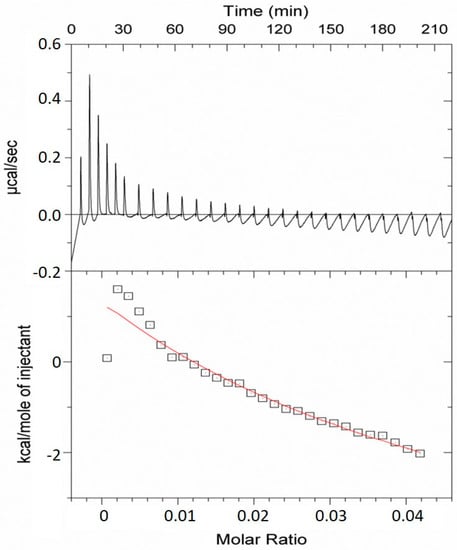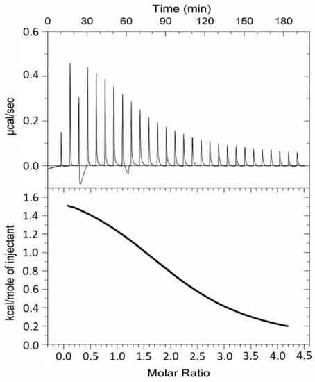 Isothermal titration calorimetry curves of the interaction between CaCl2 and TMV VLPs. 0.05 mM TMV VLPs in water were present in the assay vessel and 1 mM CaCl2 was used as the injectant. Data was acquired over a period of 3 h.