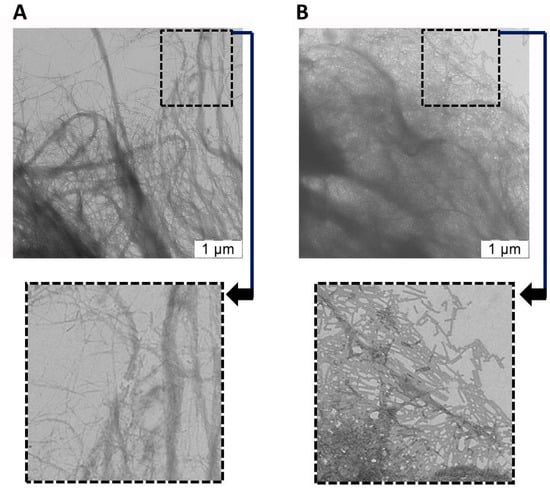 Transmission electron microscopic analysis of (A) nanocellulose only or (B) TMV VLPs mixed with nanocellulose and washed. Zoomed in regions are indicated by dotted boxes and arrows. Scale bars are provided.