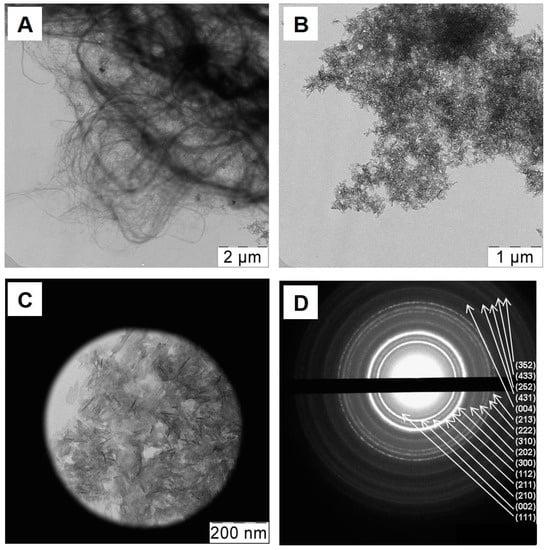 Transmission electron microscopic analysis of (A) nanocellulose after exposure to hydroxyapatite precursor salts (100 mM CaCl2 pH 4.83 and 60 mM Na2HPO4 pH 8.36), and (B) nanocellulose mixed with TMV VLPs, after exposure to hydroxyapatite precursor salts (100 mM CaCl2 pH 4.83 and 60 mM Na2HPO4 pH 8.36). Picture (C) shows selected area in (B) from which electron diffraction (D) was obtained.