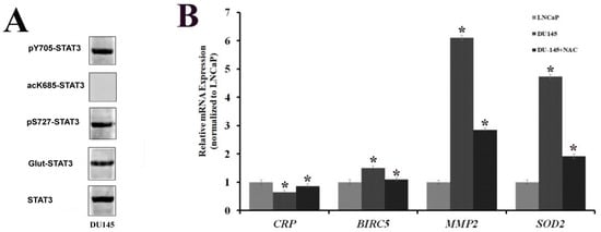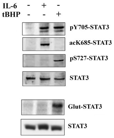 - Cocchiola, R.; Romaniello, D.; Grillo, C.; Altieri, F.; Liberti, M.; Magliocca, F.M.; Chichiarelli, S.; Marrocco, I.; Borgoni, G.; Perugia, G.; Eufemi, M. Analysis of STAT3 post-translational modifications (PTMs) in human prostate cancer with different Gleason Score. Oncotarget 2017, 27, 42560–42570. [Google Scholar] [CrossRef]