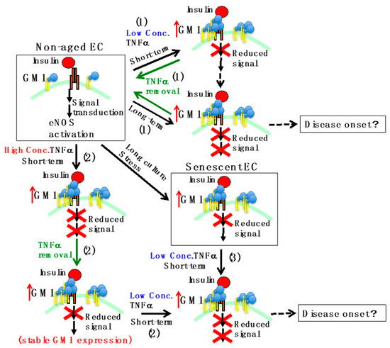 - Sasaki, N.; Itakura, Y.; Toyoda, M. Ganglioside GM1 contributes to extracellular/intracellular regulation of insulin resistance, impairment of insulin signaling and down-stream eNOS activation, in human aortic endothelial cells after short- or long-term exposure to TNF. Oncotarget 2017, 9, 5562–5577. [Google Scholar] [CrossRef][Green Version]