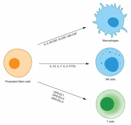 In 1998, the first human ES cells were established by the Thomson group []. Human embryos were cultured until the blastocyst stage, 14 inner cell masses were isolated, and five ES cell lines were derived. Even though human ES cells hold great potential as therapeutic cells, ethical issues remain to be resolved due to the utilization of fertilized eggs. In 2006, a monumental discovery impacted the field of translational medicine. Dr. Yamanaka discovered that mouse somatic cells can be reprogrammed to ES cell-like cells by only four transcription factors; the cells were termed iPS cells []. Mouse iPS cells have demonstrated self-renewal and differentiation activity comparable to ES cells. Soon after, the success of iPS cell generation from mouse somatic cells was applied to generate human iPS cells. A year after the first mouse iPS publication, two papers reported human somatic cell reprogramming to iPS cells [,]. Because human iPS cells can be generated from fully differentiated somatic cells, even from cells in the urine [], iPS cells are relatively free from the ethical issues faced by human ES cells. In addition, human iPS cells can be re-introduced into patients by autologous transplantation without inducing severe immune rejection. Therefore, there has been much interest in using iPS cells to generate therapeutic cells, such as hematopoietic stem cells [], retinal pigment epithelial cells [], and pancreatic beta cells []. Immune cells are invaluable cell types that can be derived from iPS cells for immune cell therapy. Such derived immune cells can be used to treat tumors that are not curable through conventional treatments in the clinic such as chemotherapy and radiation therapy. Here, the generation of three immune cell types, NK cells, macrophages, and T-cells, will be discussed (Figure 1).
