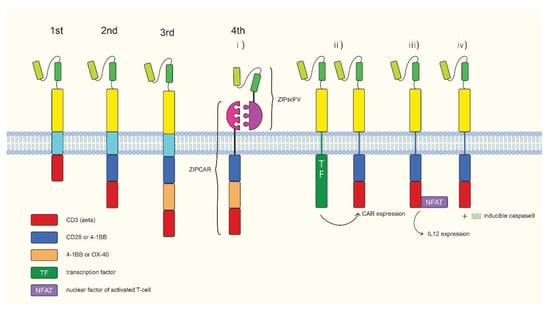 Overview of chimeric antigen receptors. Frist generation (chimeric antigen receptors) CARs contain the single chain variable (scFv) domain from a monoclonal antibody, and an intracellular signaling domain of CD3 zeta. Second generation CAR adds a co-stimulatory domain (CD28 or 4-1BB) on the first generation CAR. Third generation CAR contain two co-stimulatory domains (CD28, 4-1BB or OX40). Fourth generation CARs. The newest version is equipped with the features such as flexibility against antigens, or controllable on/off switch to increase safety and versatility of the treatment. (i) split, universal, and programmable (SUPRA) CAR-T that has a flexible antigen detection activity. (ii) Synnotch CAR-T. After binding of the first antigen, the intracellular transcription factor (TF) domain is cleaved and translocated into the nucleus to induce second CAR expression. (iii) T cell redirected universal cytokine killing (TRUCK) CAR-T cells. Once the first antigen is detected, the nuclear factor of activated T cell (NFAT) induces IL12 expression. (iv) Induced caspase 9 (iC9) CAR-T. CAR-T cells express inducible caspase 9 by chemical inducer of dimerization. This system efficiently eliminates 85%~90% of CAR-T cells improving the safety of CAR-T cells.