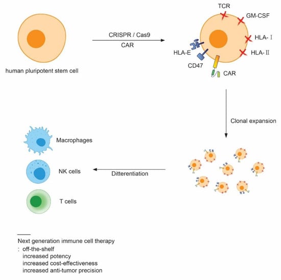Use of gene editing technology, such as the clustered regularly interspaced short palindromic repeats (CRISPR)/Cas9 system, during the generation of human pluripotent stem cell-derived immune cells could mitigate current unmet medical needs associated with the use of immune cell therapy in the clinic. Unmet medical needs related to quality control, manufacturing, and price are due to autologous transplantation, which could be resolved by generating “off-the-shelf” immune cells. For such cells to be useful, the genes related to immune responses must be modified by gene editing. For example, gene editing tools such as zinc finger nucleases, transcription activator-like effector nucleases (TALENs), and CRISPR could be utilized to modify genes encoding products such as human leukocyte antigen (HLA). However, it is well known that primary immune cells are refractory to transfection and fragile afterwards. Because primary immune cells are hostile to gene editing, human pluripotent stem cells, which can easily be engineered by virus-, RNA-, plasmid-, or protein-mediated transfection, could be an ideal cell source for generating “off-the-shelf” cells. Moreover, human pluripotent stem cells can be clonally selected after modification due to their indefinite proliferation capacity. Therefore, human pluripotent stem cells could be engineered into a universally compatible cell line to supply unlimited “off-the-shelf” immunotherapeutic cells. Two recent papers showed the possibility of generating hypoimmunogenic iPS cells that evade immune rejection by host cells after transplantation [,]. HLA class I is a key molecule that causes immune rejection of transplanted cells in allogeneic recipients. Although transplanted cells lacking HLA class I can evade CD8+ cell attack, these cells can still be surveilled by NK cells, leading to lysis, in the ‘missing self’ response. To prevent NK cell-mediated cell lysis, the authors overexpressed HLA-E, which is minimally polymorphic. They knocked-in the HLA-E gene into the beta-2 Microglobulin (B2M) locus to disrupt HLA class I expression. The HLA class I negative, HLA-E expressing iPS cells were differentiated into CD45+ hematopoietic cells and transplanted into allogeneic recipient mice []. The cell modifications prevented NK cell-mediated lysis. The other paper showed that HLA class I, II knockout, together with overexpression of CD47, a “don’t eat me” signal, can generate hypoimmunogenic iPS cells. The engineered human iPS cells were differentiated into endothelial cells, smooth muscle cells, and cardiomyocytes, and transplanted into fully MHC-mismatched allogeneic recipients. Interestingly, these cells evaded immune rejection []. To prevent graft versus host disease, the genes encoding the TCR α and β subunits should be knocked out by different gene editing tools [].