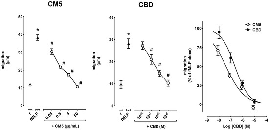 Effect of CM5 and CBD on fMLP-induced PMN migration shown as absolute values (left and centre panels) and as the percent of inhibition of migration of fMLP–stimulated PMN (right panel). Values are mean ± standard error of the mean (SEM) of 5–11 separate observations. * p < 0.0001 vs. resting and # p < 0.001 vs. fMLP alone.