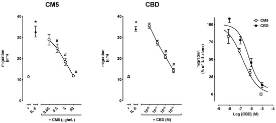 PMN migration was increased by fMLP as well as by IL-8. In particular, 0.1 μM fMLP increased migration from 11.6 ± 0.5 μm in resting cells up to 37.0 ± 1.4 μm (n = 8–11, p < 0.0001) in experiments devised to test the effect of CM5, and from 10.3 ± 1.1 μm in resting cells to 30.2 ± 1.8 μm (n = 5–8, p < 0.001) in experiments devised to test the effect of CBD (Figure 3), while 10 ng/mL IL-8 increased migration from 11.7 ± 0.3 μm in resting cells up to 32.8 ± 2.6 μm (n = 5, p < 0.001) in experiments devised to test the effect of CM5, and from 11.9 ± 0.4 μm in resting cells to 34.8 ± 1.0 μm (n = 9–12, p < 0.0001) in experiments devised to test the effect of CBD (Figure 4). CM5 and CBD concentration-dependently reverted the effect of fMLP and IL-8 down to control values with CM5 50 μg/mL and CBD 10 μM (Figure 3 and Figure 4, left and centre panels). Comparison of the Log concentration-response curves for CBD and CM5 (expressed as molar concentrations of CBD) showed, however, that CM5 was significantly more potent than CBD on fMLP-induced migration of PMN (Figure 3, right panel), as also indicated by the lower IC50 (Table 1). In comparison to the Log concentration-response curve of CBD, the curve of CM5 was shifted to the left also for IL-8-induced cell migration (Figure 4, right panel), however, the difference between the respective IC50s did not reach the statistical significance (Table 1). In resting conditions, neither CM5 nor CBD affected PMN migration at any of the concentrations tested (data not shown).