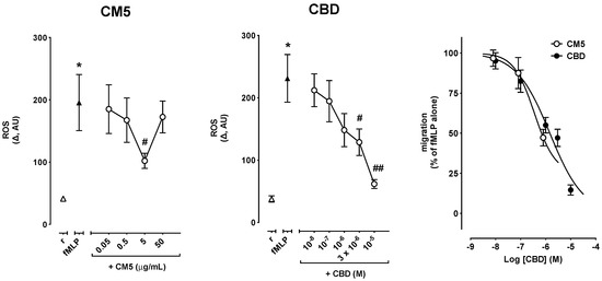 Effect of CM5 and CBD on fMLP-induced reactive oxygen species (ROS) production in PMN. ROS changes were calculated over 30 min as the difference (Δ) between resting levels and peak levels induced by fMLP. * p < 0.001 vs. resting, # p < 0.05 and ## p < 0.001 vs. fMLP alone.