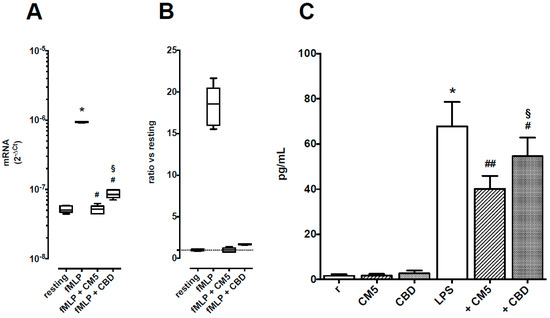 Effects of CM5 50 μg/mL and CBD 10 μM on TNF-α production in PMN. Panel A: TNF-α mRNA levels, shown as medians with 25th–75th percentiles (boxes) and min–max values (whiskers) of 5 separate observations. * p < 0.001 vs. resting, # p < 0.001 vs. fMLP alone and § p < 0.05 vs. CM5. Panel B: TNF-α mRNA levels, shown as ratio vs. resting cells. Panel C: TNF-α protein levels in supernatants from cultured PMN. Each column is the mean ± SEM of 10 separate observations. * p < 0.001 vs. resting, # p < 0.05 and ## p < 0.01 vs. LPS alone and § p < 0.05 vs. CM5.