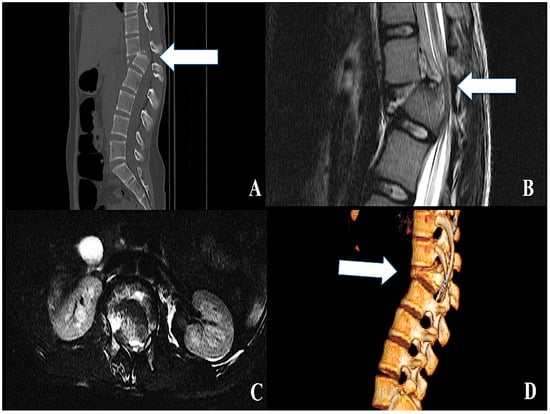 (A) Computed tomography (CT) scan disclosing a Thoracolumbar “C” type Spine Fracture Dislocation (arrow), with (B) and (C) complete Spinal Cord Injury (arrow). (D) 3D reconstruction of the CT scan disclosing the Spine Fracture Dislocation (arrow).