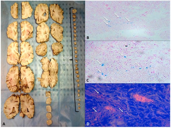 (A) After accurate sections, spinal cord roots and vertebral levels can be counted. (B) Subacute traumatic injury of the spinal cord: clearly visible, in B and C, ferrous particles deriving from hemoglobin colored by the method of Perls (arrows) (B ×60; C ×100). (D) In fluorescence, small hemorrhagic collections in subjects with acute cervical medullary injury (arrows) (×200).