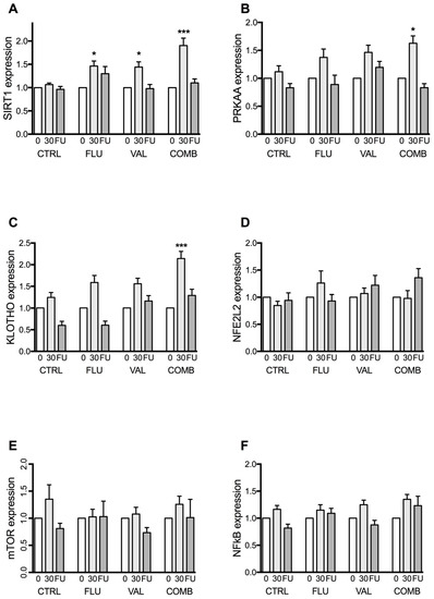 The expression of longevity genes: (A) SIRT1, (B) PRKAA, (C) KLOTHO, (D) NFE2L2, (E) mTOR, and (F) NF-κB in placebo (CTRL), low-dose fluvastatin (FLU), low-dose valsartan (VAL), or low-dose fluvastatin and valsartan combination (COMB). “0” represents the time before treatment, “30” represents the end of treatment, i.e., after 30 days (30) and “FU” represents five months after treatment discontinuation. Values are presented as means ± SEM. Presented p values are after Benjamini-Hochberg false discovery rate (FDR) correction, significance threshold set at p < 0.05. * signifies p < 0.05 and *** p < 0.001, vs. control group. SIRT1—sirtuin 1 gene; PRKAA—5′-AMP-activated protein kinase catalytic subunit α-2 gene; NFE2L2—nuclear factor (erythroid-derived 2)-like 2 gene; mTOR—mechanistic target of rapamycin (mTOR) gene; NF-κB1—nuclear factor κB gene.