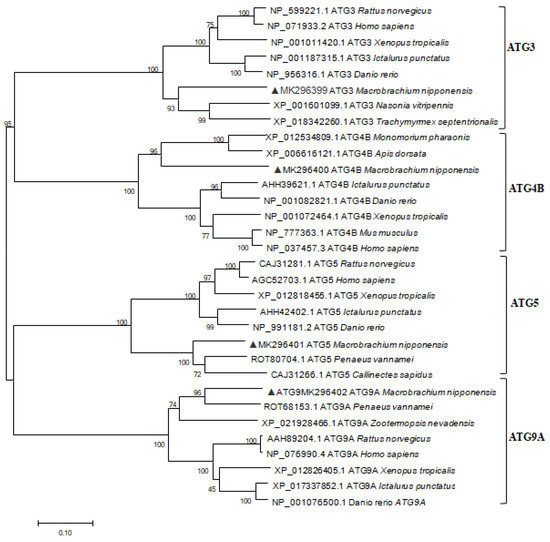 Rapid amplification of the cDNA ends (RACE) of the ATG3, ATG4B, ATG5, and ATG9A fragments yielded cDNA sequences of length 1652 bp, 1512 bp, 1731 bp and 3072 bp respectively (GenBank Accession No. MK296399, MK296400, MK296401, and MK296402 respectively), including open reading frames (ORFs) encoding proteins of 319, 264, 268 and 828 amino acids respectively (calculated molecular mass = 35.80 kDa, 47.05 kDa, 31.03 kDa and 94.53 kDa respectively; theoretical isoelectric point [pI] values = 4.65, 5.11, 5.61 and 5.99, respectively). None of the genes were predicted to include a signal peptide according to SignalP 4.0 Server (available online: http://www.cbs.dtu.dk/services/SignalP-4.0/, access date: 12 April 2019). The deduced polypeptide encoded by the M. nipponense ATG3 cDNA encodes a typical conserved active-site domain and a flexible region (Figure A1). M. nipponense ATG4B possesses characteristic features reminiscent of cysteine protease Atg4, including a conserved Peptidase_C54 domain and a probable catalytic Cys residue (Figure A2). M. nipponense ATG5 contains two ubiquitin-like domains, a helix-rich domain, and conserved calpain cleavage sites (Figure A3). M. nipponense ATG9A comprises an N- and C-terminal domains, and six transmembrane helices (Figure A4). Phylogenetic trees were constructed based on the deduced amino acid sequences of the four ATGs, revealing their evolutionary relationships (Figure 2), which were in agreement with the traditional taxonomic classification of the included species.
