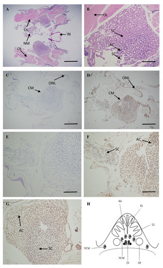 In situ hybridization of M. nipponense ATG4B transcripts in the brain tissue. (A) Photograph of M. nipponense overall brain including the nervous mass (NM), optic lobe (OL) and intermediate neurons (IN). (B) Nervous mass of M. nipponense showing secretory cells (SCs) and astrocyte cells (ACs). (C) and (E) Sense probes were used as negative controls. (D) ATG4B expression in the brain tissue of prawns in the cell mass (CM) and optic nerve lamella (ONL). (F) and (G) ATG4B was mainly expressed in the secretory cells and astrocytes cells of prawns in response to normoxia and hypoxia for 24 h, secretory cells and astrocytes cells have been distinguished with different shape, such as round and oval. (H) A schematic of the organization of the prawn brain. SG: spinal ganglion cells, NCM: neural cells mass, IN: intermediate neurons, NF: nerve fibers, FL: frontal lobe, LL: lateral lobes. Scale bar: 20 μm (A,C,D), 50 μm (B,E,F,G).