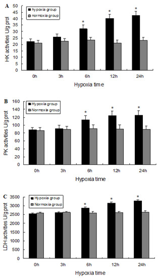 Enzyme activity was analyzed to confirm that hypoxia resulted in alterations in the metabolic pathways in the prawn brain tissue. The activities of hexokinase (HK), pyruvate kinase (PK), and lactate dehydrogenase (LDH) enzymes were significantly higher (p < 0.05) in brain after 6 h, 12 h and 24 h of hypoxia than levels in normoxia groups (Figure 6A–C). The findings indicate that hypoxia resulted in an acceleration in anaerobic glycolysis. Thus, metabolic function in the brain of juvenile M. nipponense was impaired by acute hypoxia, because the glycolytic pathway as a major source of energy is not sufficient for the ATP supply required. Next, we tried to determine whether autophagy acts as an important cytoprotective mechanism in the brain tissue of prawns in response to hypoxia.