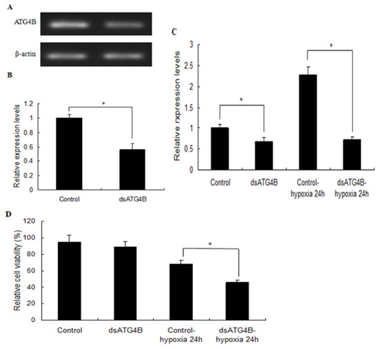 To investigate the potential function of autophagy in response to hypoxia in prawns, expression of ATG4B in brain was silenced using dsRNA (Figure 7A,B). The ubiquitin-like protein ATG8 is a reliable marker of the induction and progression of autophagy. Thus, ATG8 in M. nipponense was cloned and its mRNA expression levels were analyzed under hypoxia conditions in our laboratory [3]. The expression of ATG8 was relatively stable (< 5% changed) in brain tissue of control prawns not injected with dsRNA. By contrast, ATG8 expression decreased by 68% or 72% after 24 h under normoxia or hypoxia conditions in the brains of dsRNA-injected prawns when ATG4B is absent (Figure 7C); this indicates that ATG8 expression is regulated by ATG4B, as reported in a previous study on rainbow trout (Oncorhynchus mykiss) [15]. Injection of neither dsATG4B nor dsEGFP affected cell viability in M. nipponense juveniles prior to hypoxia exposure. However, following ATG4B knockdown, there was a significant (p < 0.05) reduction in cell viability in ATG4B-depleted prawns compared with dsEGFP-injected prawns after 24 h of hypoxia (Figure 7D). Our results provide evidence that autophagy plays a protective role in hypoxic stress.