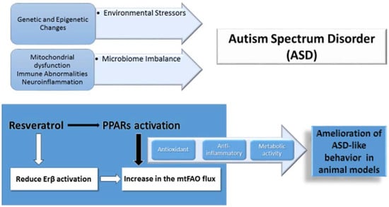 Nuclear peroxisome proliferator-activated receptors (PPAR) are ligand-activated receptors with distinct physiological functions and tissue distribution. Three PPAR isoforms, α, δ, and γ, have been described, which differ in their target genes, physiological functions, and tissue distribution [,]. PPARα and δ are preferentially involved in the control of β-oxidation in organs with high energy demands like the heart, skeletal muscle, liver, or kidneys [,,,,], whereas PPARγ is highly expressed in peripheral tissues with high fatty acid synthesis and storage, such as adipose tissue [,]. Various studies document the presence of the three PPARs isoforms in neurons and glial brain cells, and support the role of these nuclear receptors in neuroprotection [,]. Recent evidence suggests the effectiveness of PPARα activation in amelioration of core symptoms in ASD rodent models []. Moreover, the PPARγ agonist pioglitazone has been used in clinical trials suggesting that PPARs might be targets for drug therapy of ASD [,]. Resveratrol (RSV) is polyphenolic compound, considered as a natural PPARs agonist [,], and is present at high levels in red grapes, nuts, pomegranates, and in the Japanese knotgrass (Polygonum cuspidatum). RSV has metabolic, antioxidant, and anti-inflammatory activities as well as neuroprotective effects [,,,], and its therapeutic potential has been evaluated in animal models and in humans in a wide spectrum of pathologies [,]. All of these biological activities may have possible applications and points of interest in ASD therapeutics, although only a few studies have been reported concerning their potential effect on ASD treatment [,,,,].