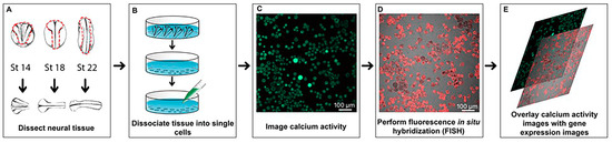 Overview schematic showing dissociation of neural tissue, calcium imaging and subsequent molecular phenotype identification of individual cells. (A) Dissection of embryonic neural tissue at neural plate (Stage 14), neural tube (Stage 18) and early tailbud stage (Stage 22). (B) Dissociation of explant in calcium and magnesium free solution followed by Fluo-4 AM treatment. (C) A representative fluorescence still image acquired using Nikon A1R Ti Laser Scanning Confocal Microscope. (D) Identification of molecular phenotype using fluorescence in situ hybridization assay. (E) Overlay of calcium activity images with gene expression.