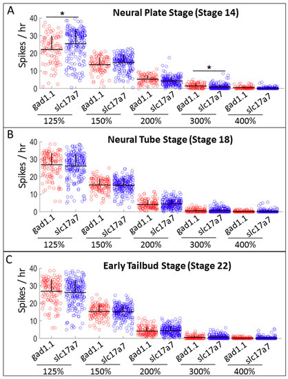 Presumptive glutamatergic cells dissected at neural plate stage of development show more low-level spiking activity, while presumptive GABAergic cells display higher-amplitude spiking. Comparison of spiking frequency counted using five different thresholds (125%, 150%, 200%, 300% and 400% of baseline), between inhibitory (gad1.1) and excitatory (slc17a7) neurons at: (A) neural plate stage (Stage 14); (B) neural tube stage (Stage 18); and (C) early tailbud stage (Stage 22). Stars represent statistically significant differences according to both Bonferroni-corrected two-sample Kolmogorov–Smirnov Test (p < 0.05) and Cohen’s d statistics for effect size (mean + SD; n = 5 cultures; * 0.2 ≤ |d| < 0.5).