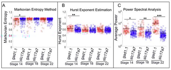 The Hurst exponent provides a measure for long-term memory or self-similarity of a time series. Our results show that the average of the estimated Hurst exponent of each cell type was above 0.5, indicating a time series with a positive autocorrelation and a persistent type of calcium dynamics. However, this metric also showed that gad1.1- and tubb2b-positive cells had significantly larger estimated Hurst exponents than sox2- and slc17a7-positive cells, suggesting that presumptive GABAergic cells and neurons committed to a differentiation pathway exhibit persistent calcium transients with high degrees of self-similarity. Markovian entropy provides a measure of the predictability of the time series, regardless of whether it is characterized by periodic or more irregular features [40,56,57]. Measured between 0 and 1, a low value indicates a predictable signal, whereas a value closer to 1 signifies an unpredictable signal. Our results suggest that sox2-positive cells and slc17a7-positive cells exhibit higher Markovian entropy than tubb2b- and gad1.1-positive cells, suggesting that neural progenitors and excitatory cells exhibit a less predictable signal characterized by a high number of small-amplitude spikes that span shorter durations, whereas inhibitory neurons and differentiated neurons exhibit a comparatively predictable signal characterized by a high number of high-amplitude spikes of longer duration. These results are consistent with the results of our Hurst exponent analysis.