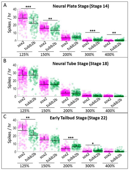 Neural progenitor cells exhibit high numbers of small spikes and lower numbers of high-amplitude spikes, but differentiated neurons exhibit a lower number of small spikes and larger number of high-amplitude spikes. Comparison of spiking frequency counted using five different thresholds (125%, 150%, 200%, 300% and 400% of baseline), between neural progenitor cells (sox2) and differentiated neurons (tubb2b) at: (A) neural plate stage (Stage 14); (B) neural tube stage (Stage 18); and (C) early tailbud stage (Stage 22). Stars represent statistically significant differences according to both Bonferroni-corrected two-sample Kolmogorov–Smirnov Test (p < 0.05) and Cohen’s d statistics for effect size (mean + SD; n = 5 cultures; * 0.2 ≤ |d| < 0.5, ** 0.5 ≤ |d| < 0.8, *** |d| ≥ 0.8).