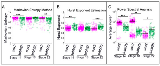 Neural progenitor cells exhibit comparatively noisy low-level calcium dynamics, while differentiated neurons exhibit relatively persistent and more predictable calcium dynamics. Comparison of Markovian entropy, estimated Hurst exponent, and average power between neural progenitor (sox2) versus differentiated neurons (tubb2b) at: (A) neural plate stage (Stage 14); (B) neural tube stage (Stage 18); and (C) early tailbud stage (Stage 22). Stars represent statistically significant differences according to both Bonferroni-corrected two-sample Kolmogorov–Smirnov Test (p < 0.05) and Cohen’s d statistics for effect size (mean + SD; n = 5 cultures; * 0.2 ≤ |d| < 0.5, ** 0.5 ≤ |d| < 0.8, *** |d| ≥ 0.8). Markovian entropy was calculated with n = 4 and k = 1.