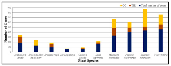 Plant immunity comprises two tiers [6,7]. Primarily, pathogen-associated molecular patterns (PAMPs), microbial-associated molecular patterns (MAMPs), or damage-associated molecular patterns (DAMPs) are recognized by host surface receptor proteins called pattern-recognition receptors (PRRs). PRRs can be categorized as plasma-membrane-localized receptor kinases (RKs) or receptor-like proteins (RLPs). RKs possess an ectodomain for binding with ligands, a single transmembrane domain, and an intracellular kinase domain. RLPs are deficient in apparent intracellular signaling domains. More than 600 receptor-kinase genes and 57 receptor-like proteins have been reported in the Arabidopsis genome. Among these, many are involved in biotic stress responses [8,9]. The nucleotide-binding leucine-rich repeats (NB-LRR) gene family is one of the largest gene families in the Plantae kingdom. NB-LRR genes are found as isolated genes as well as in clusters of different sizes. NB-LRRs are devoid of definite kinase domains and found attached to additional domains [10,11,12]. On the basis of the amino terminus, NB-LRRs are divided into two major groups, i.e., toll interleukin 1 receptor NB-LRR (TIR-NB-LRR) and coiled-coil-NB-LRR (CC-NB-LRR).