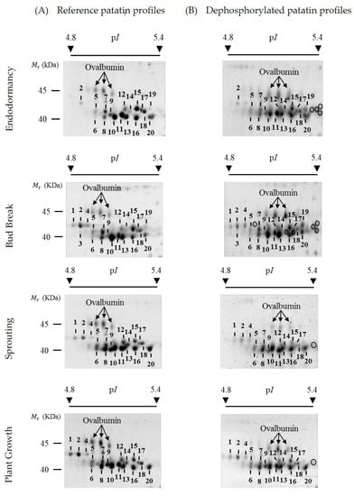 Patatin profiles on 2-DE gels stained with Pro-Q Diamond phosphoprotein-specific fluorescent dye in endodormancy, bud break, sprouting and plant growth tuber stages of Kennebec cultivar are shown in Supplementary Figure S1 (Supplementary Materials). All 2-DE patatin spots contained phosphorylated isoforms because they were reproducibly Pro-Q-Diamond-stained across biological replicates. These results suggest that the above-mentioned variations in the number of Kuras isoforms contribute to the increase of patatin phosphorylation after the endodormancy stage.