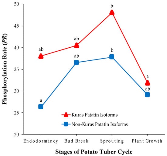 Temporal changes in the phosphorylation status of Kuras and non-Kuras patatin isoforms in the different stages of the potato tuber life cycle: endodormancy, bud break, sprouting and plant growth. Values on the y-axis are means of PR computed from four biological replicate gels over Kuras (triangles) and non-Kuras (squares) patatin spots. Different lower case letters (a and b) indicate statistically significant differences (p < 0.05) between sample groups by the post hoc Tukey-Kramer test following the one-way ANOVA test.