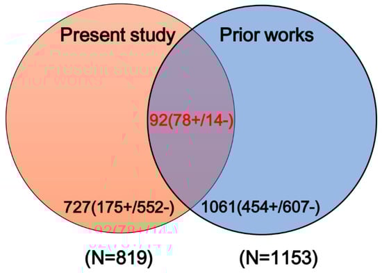 - High-quality label annotation always assists in creating accurate and reliable in silico models. To minimize the risk brought by ambiguous data, a critical data screening strategy was established. Data from DILIrank [42], Livertox [44], and LTKB [45] were retained directly and marked as dataset 1. For other datasets, the compounds included in dataset 1 were discarded, and the remaining data were named as dataset 2. Compounds with conflicting class labels were removed from dataset 2, and the remaining data were utilized to develop a large-scale dataset for hepatotoxicity in combination with dataset 1. Finally, a total of 1880 compounds were retained, 707 positives and 1173 negatives. As shown in Figure 4, a total of 1153 compounds originated from datasets of prior studies, and the present study provided 819 compounds (727 new compounds).