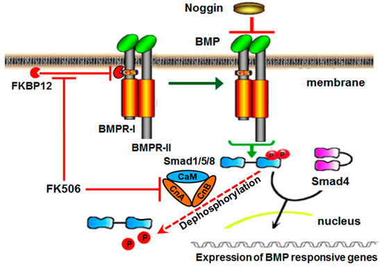 Figure 1. Bone morphogenetic protein (BMP) signaling pathway and inhibition by Noggin. The BMP dimer binds to BMP receptor type II, which recruits type I receptors so that a hetero-tetramer is formed with two receptors of each type. The proximity of the receptors allows the type II receptor to phosphorylate the type I receptor. Activated type I receptors phosphorylate R-smads or receptor-regulated Smads (Smad1/5/8), which form complexes with Smad4. Activated Smad complexes regulate gene expression of several target genes. Calcineurin is a Ca++–calmodulin-dependent serine/threonine protein phosphatase. It is a heterodimer of a ~60 kDa catalytic subunit, calcineurin A (CnA), and a 19 kDa regulatory subunit, calcineurin B (CnB), and has been implicated in the BMP pathway as depicted.